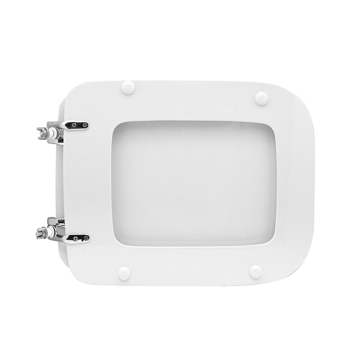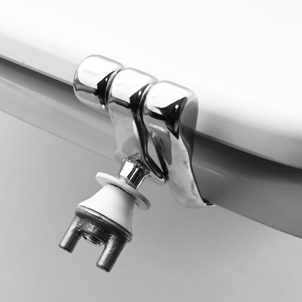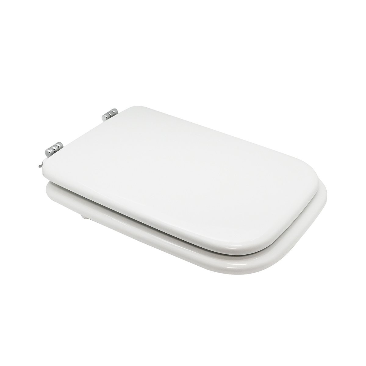 Sedile in legno stabilizzato, colato in poliestere. Cerniere oblique fisse in ottone cromato e viti di fissaggio in acciaio inox.