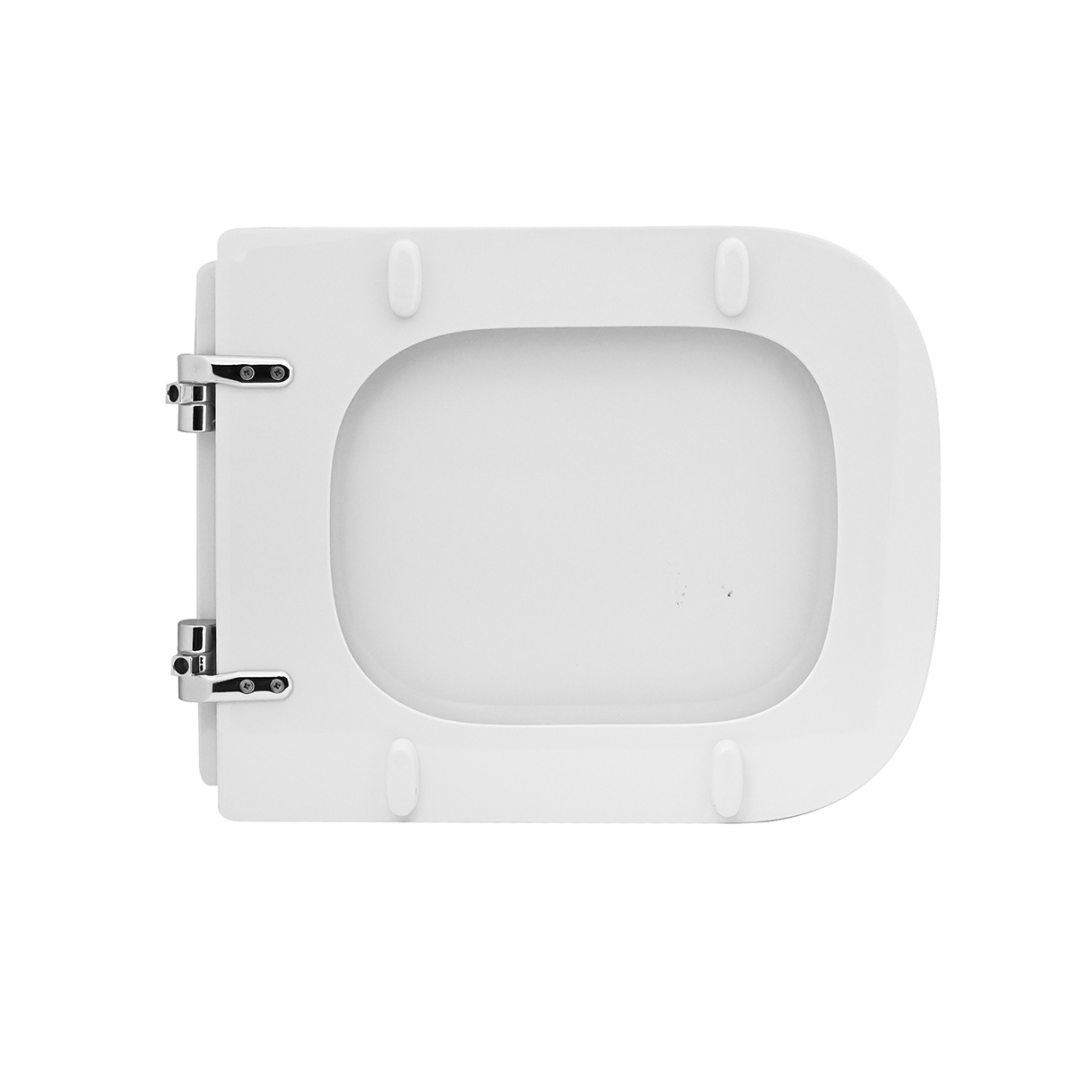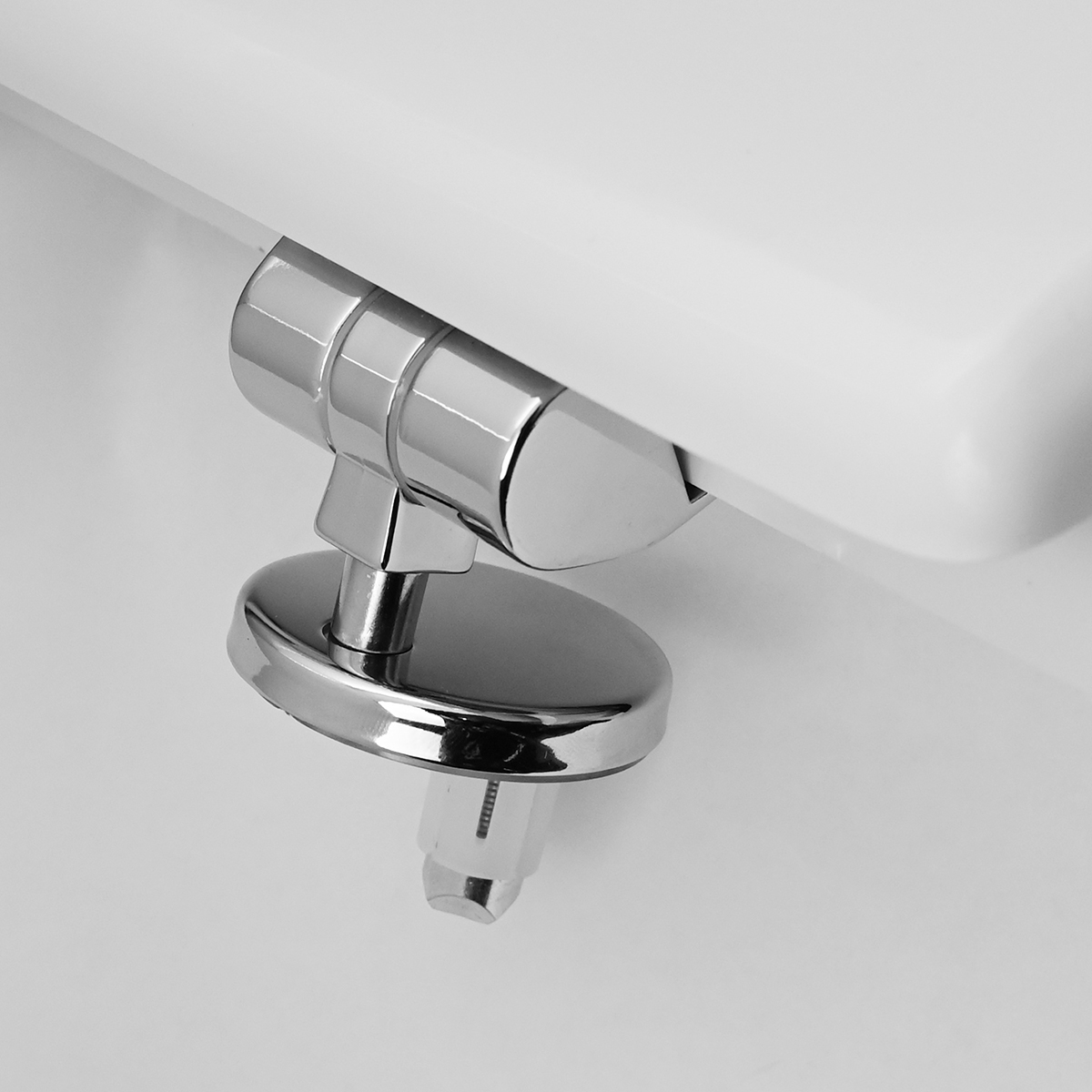 Sedile in legno lavorato, stabilizzato in poliestere. Cerniere soft closing e viti di fissaggio in acciaio inox.