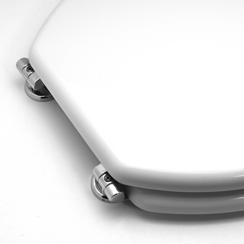 Cerniere regolabili. Sedile in legno stabilizzato, colato in poliestere. Cerniere in ottone cromato e viti di fissaggio in acciaio inox.