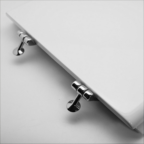 Cerniere fisse. Sedile in legno stabilizzato, colato in poliestere. Cerniere in ottone cromato e viti di fissaggio in acciaio inox.