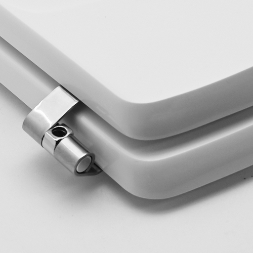 Sedile in legno stabilizzato, colato in poliestere. Cerniere regolabili in acciaio inox.