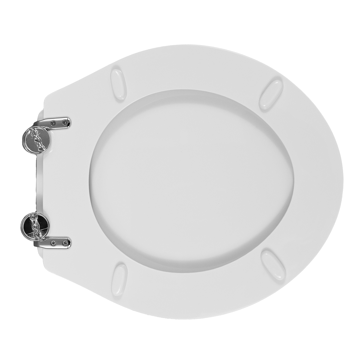 Sedile in legno lavorato, colato in poliestere. Cerniere regolabili in ottone cromato e viti di fissaggio in acciaio inox.