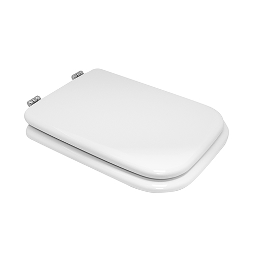 Sedile in legno stabilizzato, colato in poliestere. Cerniere fisse oblique in ottone cromato e viti di fissaggio in acciaio inox.